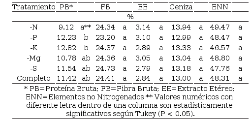 El efecto de la omisión de nutrientes sobre la composición bromatológica del pasto raigrás a la cuarta semana después de la siembra se presenta en la Tabla 3. Se encontró que solamente varía estadísticamente el contenido de proteína con la omisión del nutriente (P < 0.05), siendo el tratamiento de -N el que acumula la menor cantidad de proteína con 9.12 %, los valores más altos los registraron la omisión de P y la omisión de K con 12.23 y 12.82 %, respectivamente y valores intermedios se presentaron en los tratamientos -Mg, -S y la fertilización completa con 10.78, 11.54 y 11.42 %, respectivamente. Esta condición ha sido ampliamente reportada en la literatura en diversos países en América Latina ( Fontanetto et al., 2010 ; Teuber et al., 1988 ; Villalobos & Sánchez, 2010). Los cambios observados en el resto de parámetros de la composición bromatológica evaluados (fibra, extracto etéreo, cenizas y extracto no nitrogenado) no fueron estadísticamente diferentes.