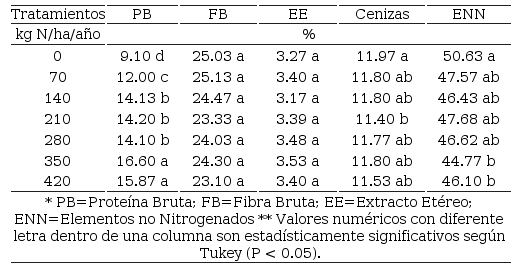 El análisis del extracto no nitrogenado (ENN) también encontró que se produjeron cambios como efecto de los tratamientos. Los contenidos más bajos los registraron N350 y N420 con 43,77 y 46,1%, respectivamente, mientras que los más altos se alcanzaron con N0 con 50, 63%. Los valores intermedios se lograron con N70, N140, N210 y N 280 con 47.57, 46.43, 47.68 y 46.42 %, respectivamente ( Tabla 4). Se ha demostrado que la fertilización nitrogenada reduce el contenido de ENN en raigrás anual y avena durante el rebrote invernal ( Marino et al., 1996 ), información que coincide los datos obtenidos en esta investigación.