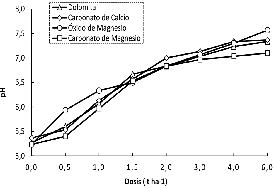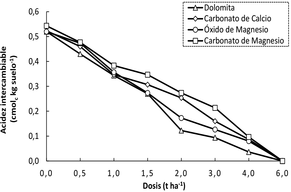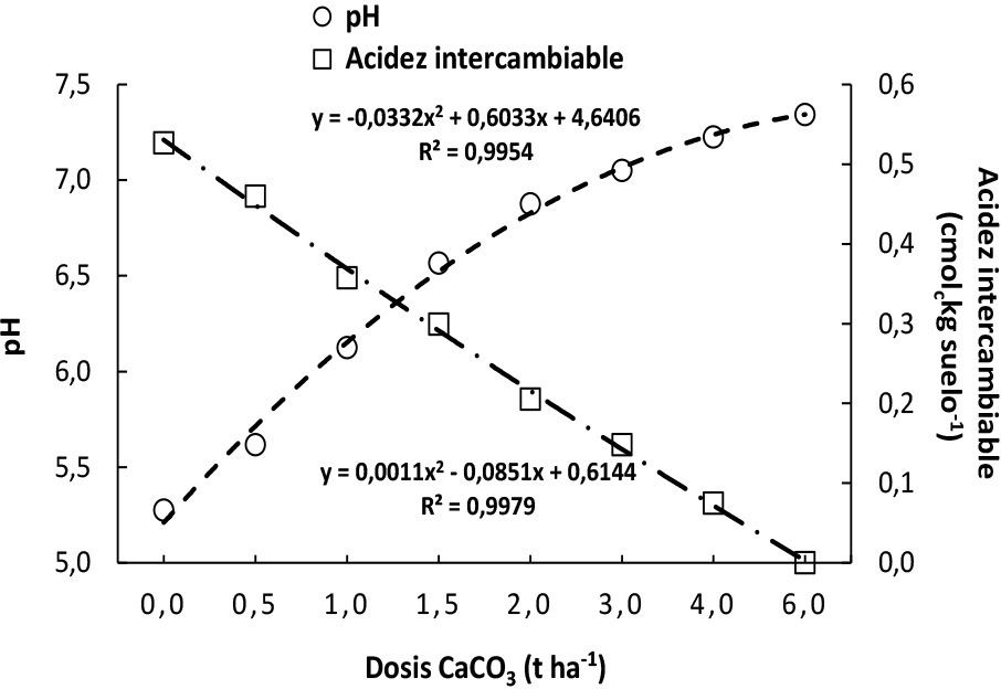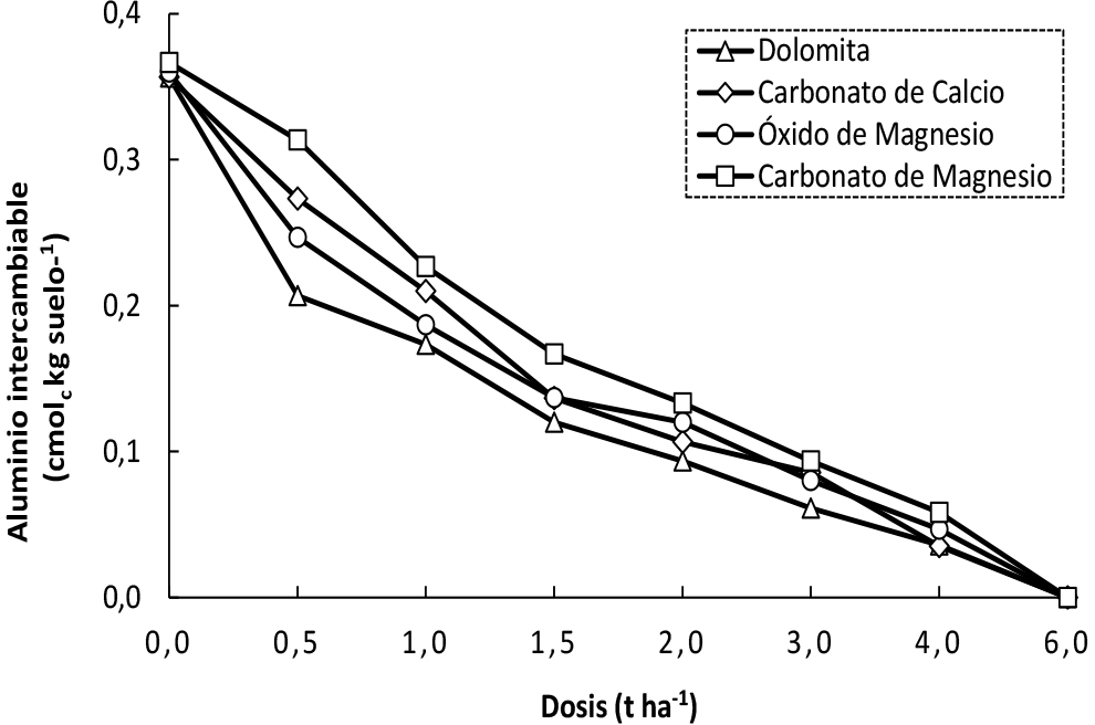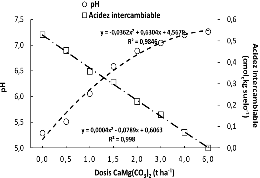 Los resultados de los análisis de suelos para evaluar el efecto de las dosis de las enmiendas en el comportamiento del pH, acidez intercambiable y aluminio intercambiable demostraron que todas las enmiendas utilizadas tuvieron el mismo comportamiento. Como era de esperarse, el pH se incrementó y los contenidos de acidez intercambiable y aluminio intercambiable se redujeron, sin embargo, fue claro que las dosis altas (2, 3, 4 y 6 t ha -1) no eran necesarias para precipitar la mayor parte del Al +3, mejorar el ambiente radicular y promover la mayor acumulación de biomasa. Las dosis que logran estos efectos benéficos están de nuevo entre 1.0 y 1.5 t ha -1 de dolomita y carbonato de calcio.