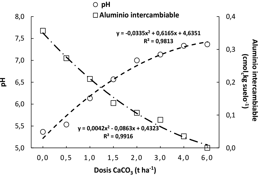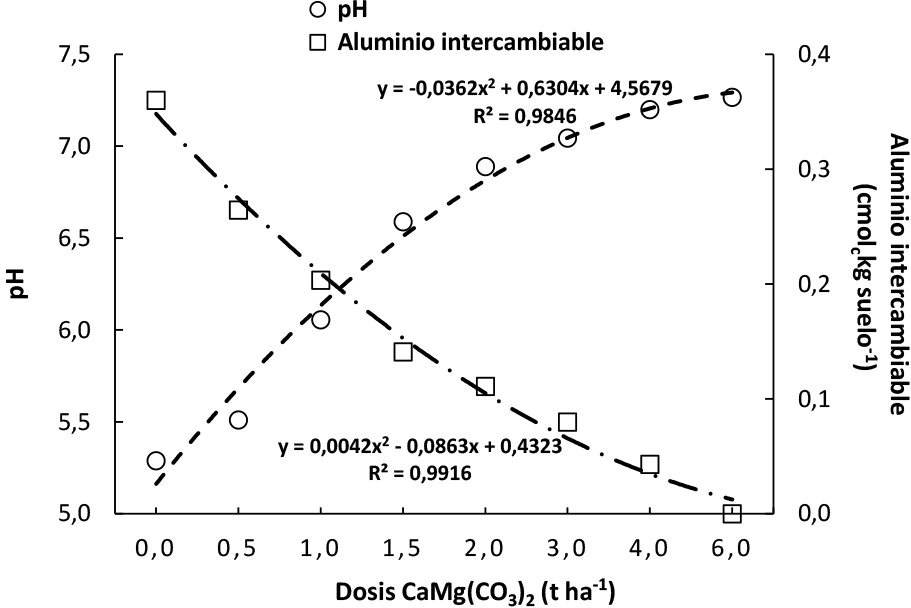 La evaluación de las interacciones pH - acidez intercambiable y pH - aluminio intercambiable también permite concluir que las mejores dosis para lograr la mayor acumulación de biomasa están entre 1.0 y 1.5 t ha -1 de dolomita y carbonato de calcio, sin embargo, la interacción con aluminio intercambiable detecta mejor el rango de dosis adecuadas.