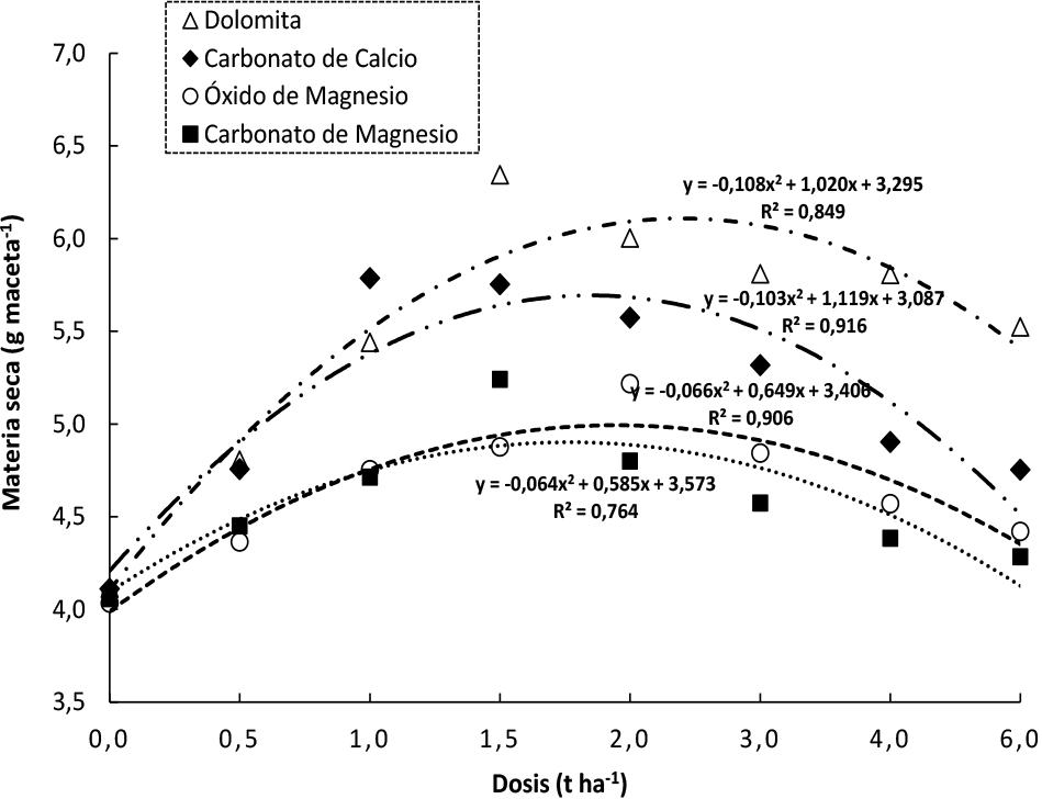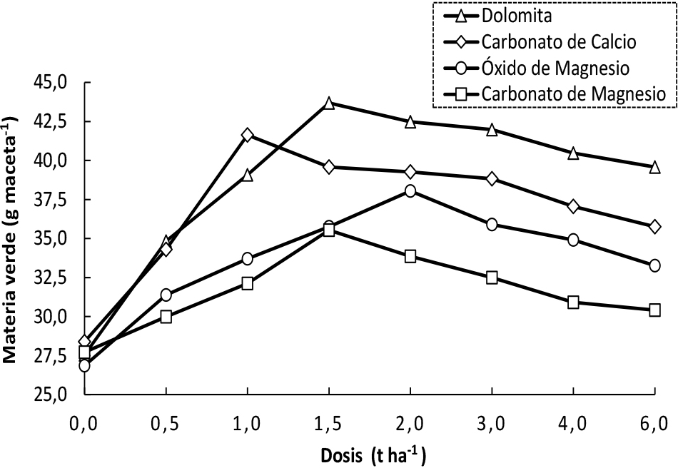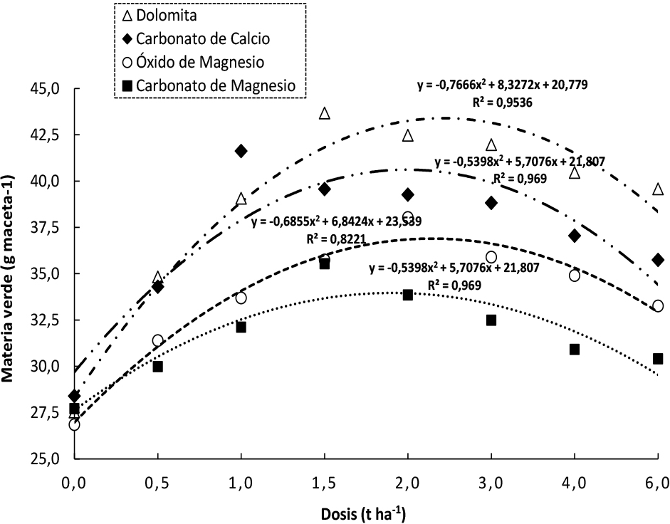 En los últimos años se ha popularizado la utilización de carbonato de calcio y, en menor proporción, la de dolomita en las áreas productoras de maíz del cantón Loreto por recomendación de los programas de mejoramiento de la producción del MAGAP ( Vallejo, 2015). Los datos obtenidos en este estudio ratifican que las mejores fuentes para ese tipo de suelo son, en efecto, carbonato de calcio (cal agrícola) y dolomita. El carbonato de magnesio y el óxido de magnesio demostraron ser menos efectivos para controlar la acidez y producir biomasa ( Figuras 1 y 2). Sin embargo, la determinación de la cantidad de material a aplicarse para encalar los suelos ácidos de la zona es todavía anárquica. Si solamente se utilizaran los datos de las regresiones de producción materia verde y particularmente los datos de materia para determinar la dosis de carbonato de calcio y dolomita se podrían recomendar dosis de 2.0 a 2.5 t ha -1, pero el ajuste de valores que logra el cálculo de la regresión para producción de biomasa llevaría a sobre estimar las dosis de enmienda requerida. Si se utiliza solamente el gráfico de la tendencia de la acumulación de materia verde y materia seca se logra una mejor aproximación a la dosis real como se puede observar en las Figuras 3 y 4. En este caso solamente se requerían entre 1.0 y 1.5 t ha -1 de material para lograr el efecto deseado ya que se observa claramente que dosis mayores reducen la acumulación de biomasa