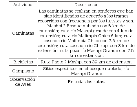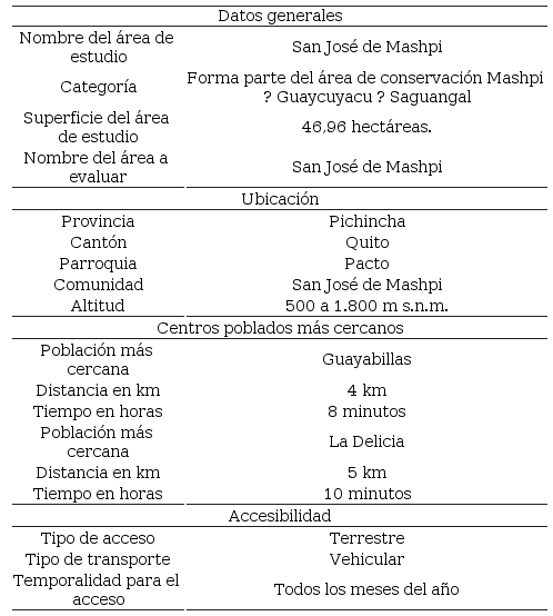 En relación con la selección y caracterización del sitio de visita, el área de conservación Mashpi? Guaycuyacu ? Saguangal se encuentra ubicada en una zona natural muy extensa, por lo que se decidió hacer el estudio en un sector más pequeño y con mayor afluencia turística como es el caso de San José de Mashpi ( Tabla 1). Esta segmentación territorial ha permitido identificar problemáticas y preocupaciones que pueden ser solucionadas o evitadas.
