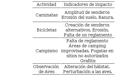 La zona de estudio ofrece las actividades recogidas en la Tabla 2, mientras que la identificación de los indicadores de impacto se presenta en la Tabla 3.