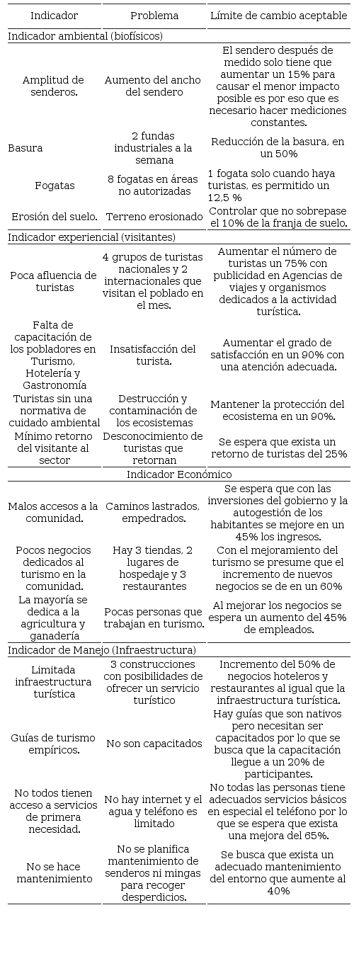 En relación con los métodos de medición de los indicadores, el área de estudio ha sido analizada y se ha llegado a determinar los indicadores de la Tabla 4, en tanto que la definición de Límites de Cambios Aceptables y evaluación de la situación actual se presentan en la Tabla 5.