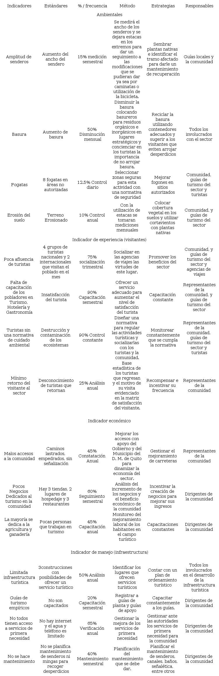 Abstract: This article was aimed at evaluating the impacts tourism activities, under the methodology of acceptable change limit, in the area of conservation Mashpi - Guaycuyacu - Saguangal. We used field research methods, as well as analysis of primary and secondary sources. In historical terms, the area of conservation has a diverse ecosystem, which is appreciated by the visitos who provide income for the local population, but who on the other hand, had an impact on the environment. These have been solved by the methodology of acceptable change limit which has been selected, previous an analysis of other monitoring systems such as pressure- state- response, visitor impact management, Tourism Management System, and Visitor Experience and Resources Protection. As result of this research work, we were able to characterize the sites of visit, to identify the indicators of impact, to determine the measurement methods of the indicators, to establish acceptable change limit, to evaluate the site, to define strategies of management, and to follow-up and monitor the process.