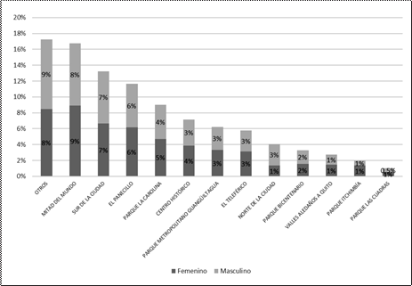 Los residentes femeninos en la ciudad ( Figura 9) no han frecuentado a la Mitad del Mundo, seguido por diferentes EPO en la categoría otros y en el tercer lugar, los espacios ubicados en el sur de la ciudad. Por otra parte, el género masculino en primer lugar elige a otros sitios, después se registra la Mitad del Mundo y finalmente la tercera opción también es el extenso sur de Quito. Se identifican sitios menos frecuentados, tal es el caso del Centro Histórico, El Panecillo, el Teleférico, el norte de la ciudad, parque Bicentenario, parque Itchimbía, parque La Carolina, parque Las Cuadras, parque metropolitano Guangüiltagua y valles aledaños a la urbe.