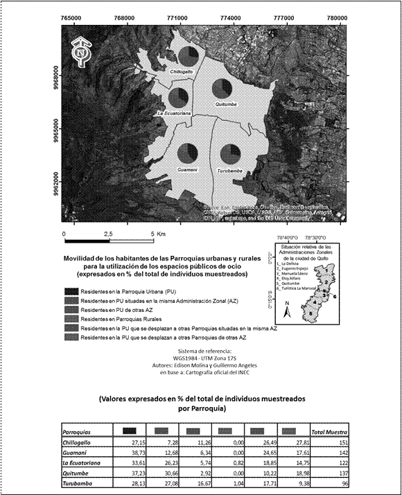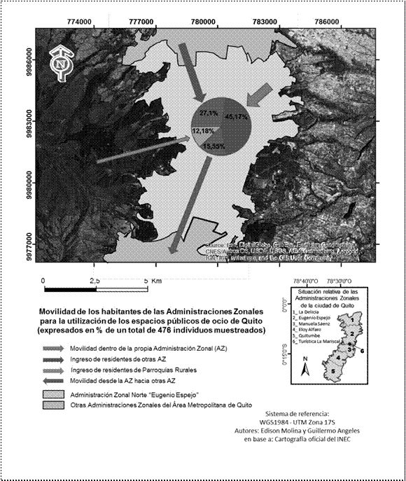 Resumen: El presente artículo muestra el perfil del residente en base a las actividades de ocio realizadas en el espacio público de la ciudad de Quito, na metrópoli con características físicas que influyen en la movilidad. La aplicación del estudio empírico dio las pautas necesarias para identificar las preferencias del habitante. El enfoque geográfico presentado relaciona el estudio del ocio y las repercusiones espaciales en el contexto territorial de la urbe. El cuestionario elaborado cuenta con indicadores sobre datos informativos, gustos, percepción y satisfacción sobre la oferta vigente a la que tiene acceso el residente, que responden a la experiencia vivida en el ámbito del ocio. La segmentación de grupos de edades presenta características particulares, además de una diferenciación entre los resultados obtenidos entre los géneros masculino y femenino. Con el apoyo de los sistemas de información geográfica, se pudo obtener la concentración en el uso y la movilidad de los residentes hacia los espacios públicos de ocio (EPO) dentro de las administraciones zonales (AZ) y su relación con las parroquias de Quito.