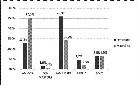El análisis de la Figura 4, muestra la elección por el ocio grupal, sobre el individual. Los residentes prefieren visitar los sitios de ocio en compañía de amigos y familiares. Si bien en Quito existen varios grupos muy adeptos a las mascotas, apenas se registró un porcentaje que no supera el 1,6% de residentes que salen a pasear con sus animales.