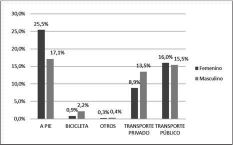 Los residentes ( Figura 7) llegan a los EPO a pie por su cercanía con su residencia, luego el transporte público es el preferido. La elección del transporte privado se encuentra en tercer lugar. Las categorías bicicleta y otros medios presentan valores poco significativos. Es imprescindible señalar que, a pesar de la implementación de vías para ciclistas en algunas zonas de la urbe, la afluencia en los residentes hacia los EPO es aún muy baja.