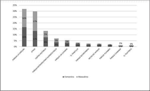 Los residentes de Quito ( Figura 8) les agrada los parques metropolitanos, en el caso de las mujeres, aparece como primera opción, el parque La Carolina, que es uno de los más emblemáticos de la urbe, seguido por una diversidad de opciones que oferta los EPO en la categoría otros. Para el caso de los hombres, la primera opción es la categoría otros, que incluye un sin número de lugares a escala barrial, luego la predilección por el parque La Carolina. Como tercer lugar aparece el Centro Histórico para ambos grupos. Varios sitios como: El Panecillo, El Teleférico, la Mitad del Mundo, parque Bicentenario, parque Cumandá, parque Itchimbía, parque Las Cuadras y el parque metropolitano Guangüiltagua, son mencionados, pero con menores respuestas.