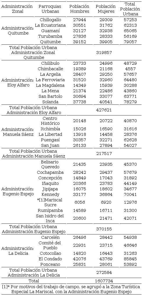 Esta herramienta contiene datos informativos referentes a la ubicación, género, estado civil, residencia, edad, ocupación y nivel de estudios; posteriormente se encuentran preguntas estructuradas sobre las actividades de ocio relacionadas con lugares, frecuencia, tiempo desplazamiento, grupo social y aspectos a considerar; por último, se definen tres preguntas abiertas para identificar la percepción de los residentes y conocer la satisfacción en base a la oferta actual. La encuesta estará dirigida a hombres y mujeres de 16 años en adelante sin considerar ocupación, estado civil y nivel de estudio. Para poder aplicar la encuesta fue necesario la determinación del área de estudio de la presente investigación, que es la parte comprendida por las 32 PU, la población universo es de 1´619.146 habitantes, lo cual equivale al 72,3% de la población total del DMQ. Se procedió a extraer la porción del total de la población en el área urbana de las AZ Quitumbe (AZQ), Eloy Alfaro (AZEA), Manuela Sáenz (AZMS), Eugenio Espejo (AZEE) y La Delicia (AZLD); cabe mencionar que la Administración Especial Turística La Mariscal (AETM) por tema de agrupación y trabajo previsto, se encuentra inmersa en la AZEE por compartir la parroquia Mariscal Sucre. La división establecida fue valedera para certificar la encuesta en relación a la cantidad de residentes.