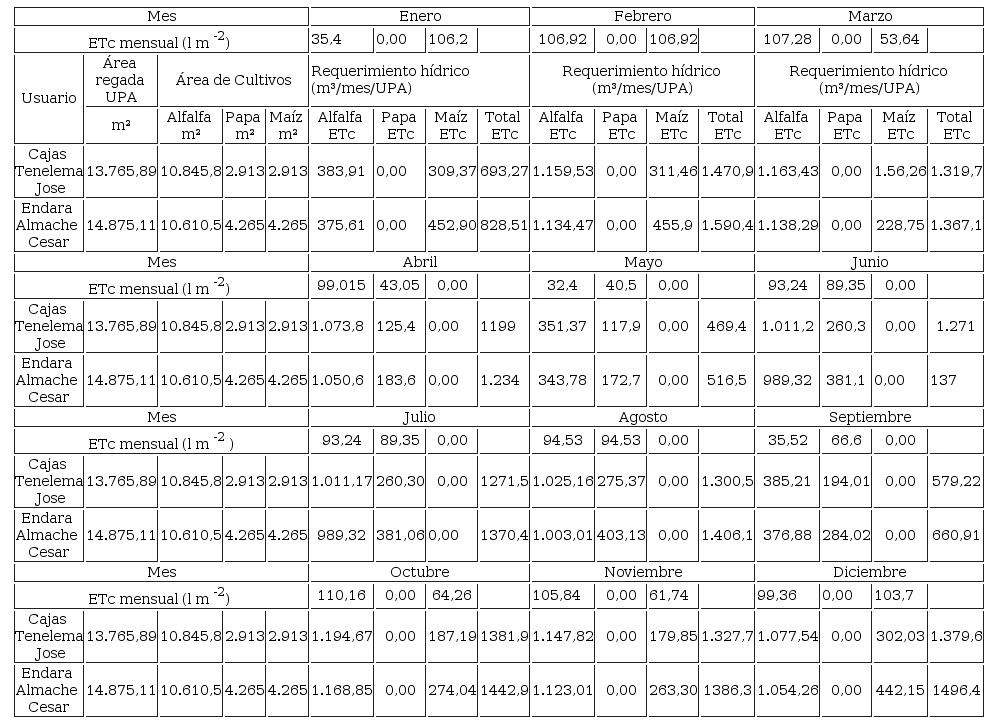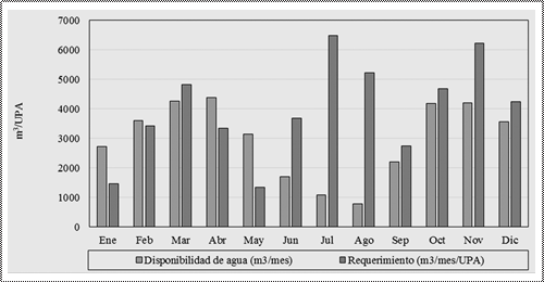 La representación de la distribución de la disponibilidad de agua, así como el requerimiento de los cultivos, para los 23 agricultores (UPA), pertenecientes al sistema de producción uno, que se dedican al cultivo de papa y pasto para ganado, se observa en la Figura 1. En este caso, se encontró que existen déficits anuales desde 2.418 m 3 por año, para parcelas de 1,5 ha, hasta déficits de 24.735 m 3 en parcelas con superficies mayores a 10 ha.