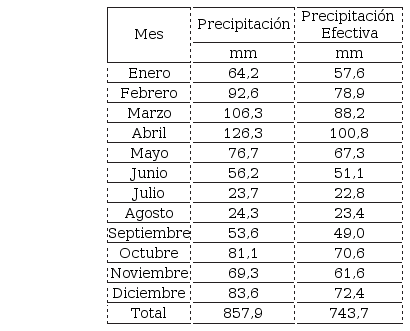La precipitación efectiva en los sitios de estudio se calculó utilizando el modelo ?Cropwat 8? de la FAO, que se soporta en variables como: pendiente, cobertura vegetal, humedad de la capa superficial del suelo, y cantidad e intensidad de lluvia. Este modelo cuenta con cinco métodos de cálculo que utilizan las variables, de los cuales, en la presente investigación se utilizó el método recomienda por la FAO y se denomina método del Servicio de Conservación de Suelos del Departamento de Agricultura de los Estados Unidos (USDA S.C.), que se especifica en la Ecuación [1] ( Fernández et al., 2012 ; Swennenhuis, 2009).