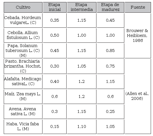 Kc: Coeficiente del cultivo. Depende del cultivo y su estado fisiológico ( Tabla 2)