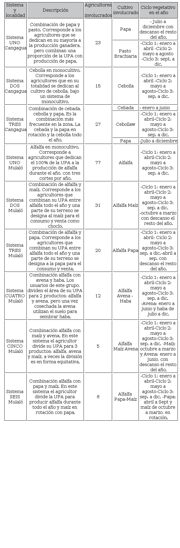 La investigación se realizó para tres sistemas de producción, repartidos en cuatro comunidades de la parroquia rural Cangagua, cantón Cayambe, con una muestra de 65 usuarios (UPA), de la Junta de Riego Porotog; y para seis sistemas de producción en la comunidad San Ramón de la parroquia Mulaló, del cantón Latacunga, con 151 usuarios (UPA) ( Tabla 3). Se midió las entradas efectivas de agua a la UPA, para contrastar con las necesidades de los sistemas de producción regados en cada UPA. En el caso de Cangagua, el caudal de agua de riego disponible por UPA se cuantificó de la información determinada en una investigación anterior ( Quishpe, 2015); mientras que en el caso Mulaló, el caudal se midió directamente en la entrada de cada UPA. La información complementaria para la investigación fue obtenida de fuentes oficiales, así: los datos de precipitación temperatura, velocidad del viento, humedad relativa y radiación. Se tomaron de las bases de datos del Instituto Nacional de Meteorología e Hidrología (INAMHI), de las estaciones de influencia para las áreas en estudio: Estación Pluviométrica Cangagua y Estación Meteorológica Tomalón-Tabacundo, para Cangagua. Estación Pluviométrica Pastocalle y Estación Meteorológica Rumipamba-Salcedo, para Mulaló. En todos los casos se trabajó con valores promedio de una serie datos de los últimos 30 años disponibles en el INAMHI. Se aclara que no se ha hecho ninguna clase de ajuste a los métodos ni a los modelos de cálculo y toma de datos del INAMHI, ni para las variables climáticas utilizadas en los modelos ni por los sitios o áreas de influencia definidas por esta institución.