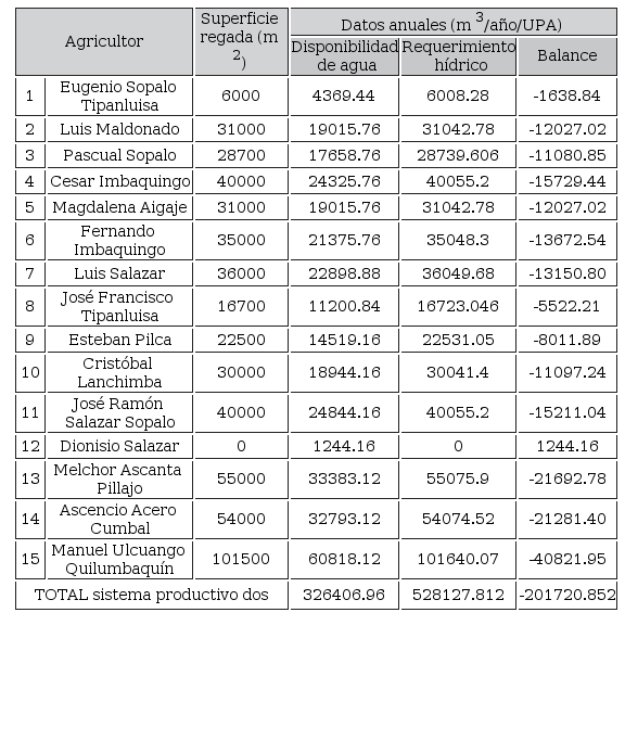 Además, hay que tener en cuenta que la figura del reparto equitativo del agua de riego, aplicado como regla general entre los miembros de las comunidades y juntas de regantes, no es compatible con el aprovechamiento eficiente del agua. En la mayoría, se reparte un mismo caudal de agua sin importar la superficie de la UPA ni la superficie a regarse dentro de la misma; pues el caudal asignado a cada agricultor es el producto de la división del caudal total de la comunidad para el número de beneficiarios del riego ( Quishpe, 2015). Este sistema de reparto del agua de riego, es equitativo pero antitécnico, porque se entrega la ración de agua, inclusive para aquel que no riega como es el caso del agricultor 12 del sistema productivo dos, Tabla 5, que no posee área regada en la parcela y sin embargo tiene acceso al agua.
