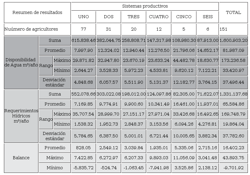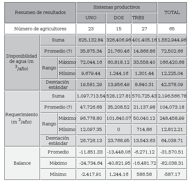 Al analizar los tres sistemas productivos, con base en un ciclo anual de producción, se aprecia que, en la gran mayoría de las UPA, los agricultores no disponen del agua requerida para regar sus cultivos en las superficies que tienen bajo riego. En los tres casos se evidencia que la disponibilidad de agua de riego está por debajo de los requerimientos de los cultivos. Se observa además que el fenómeno de falta de agua es más agudo en las UPA que poseen mayor superficie regable y, por ende, mayor superficie regada.