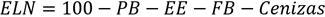 La misma muestra de MS se trituró en una malla 750 micras y con este material se realizaron los análisis de proteína (PB) por medio del método semimicro Kjeldahl); elementos etéreo (EE) con el método Soxhlet; fibra bruta (FB), método de referencia de la AOAC: 978.10) y cenizas (CE) con el método de referencia de la AOAC: 942.05 ( Flores & Rodríguez, 2017). El contenido de los alimentos en carbohidratos intracelulares se estima como la diferencia entre la (MS) del alimento y el resto de nutrientes (cenizas, proteína bruta, extracto etéreo y componentes de la pared celular). Según el análisis efectuado para determinar los componentes de la pared celular, la cantidad de carbohidratos intracelulares se denomina: extractos libres de nitrógeno (ELN): relacionados con la fibra bruta y carbohidratos no estructurales (CNE): relacionados con la fibra neutro detergente. Para este trabajo se determinó los ELN en base seca según la siguiente ecuación: