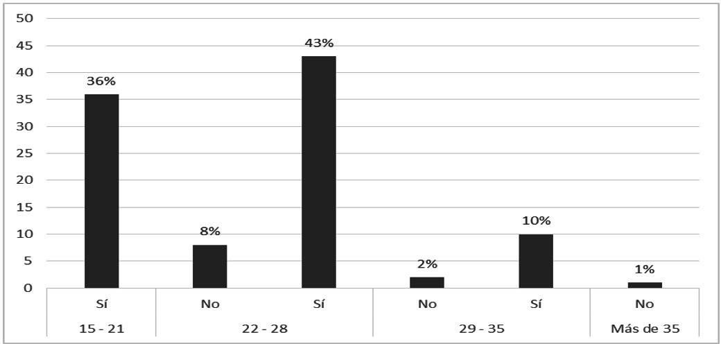 El análisis estadístico se realizó mediante el cruce de variables, destacando los siguientes resultados. La Figura 1 resalta la influencia que tiene la edad con relación al gusto sobre el deporte de aventura ciclismo, ya que mientras avanza la edad menos prefieren realizar este tipo de deporte. El rango de edad que prefiere realizar ciclismo va desde los 22 a 28 años con un total de 43% de encuestados, y de 15 a 21 años con 36%. Esto presenta que el producto ofertado tendrá una mayor acogida para las personas jóvenes, causando que el perfil del turista sea completamente inclinado al turismo de aventura. Esto facilita la promoción buscando el mercado juvenil, por otro lado, están las personas con un rango de edad de 29 a 35 años y personas de 36 años en adelante que prefieren alejarse de este deporte de aventura.