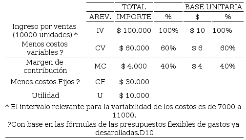 El Margen de Contribución, para Ibid (2005), implica el empleo de una serie de técnicas analíticas para determinar y evaluar los efectos que sobre las utilidades pueden tener los cambios en el volumen de ventas (esto es, en las unidades vendidas), en los precios de venta, en los costos fijos y en los costos variables. Se enfoca en el margen de contribución, que es el ingreso por ventas menos los costos variables totales ( Tabla 1). Las compañías que identifican y miden por separado los componentes fijos y variables del costo, a menudo utilizan un enfoque del margen de contribución en sus estados periódicos de resultados que preparan para uso interno de la administración.