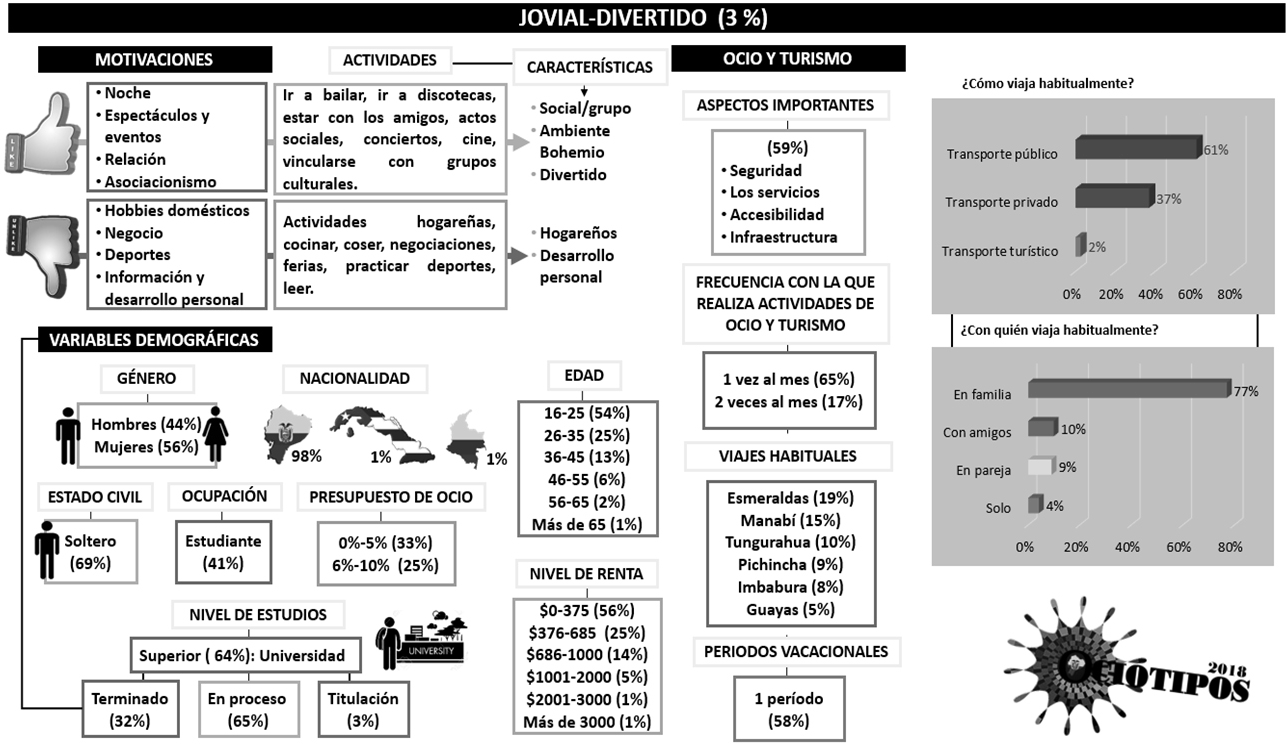 OCIOTIPO JOVIAL-DIVERTIDO. Les interesa como motivaciones principales y secundarias aquellas que tienen que ver con un ambiente divertido y entretenido, les gusta formar parte de un grupo social, les agradan los lugares ruidosos con un ambiente placentero ( Figura 8). Por el contrario, se niegan a realizar actividades vinculadas al hogar o tareas domésticas y son bastante desprendidos de la lectura y la práctica de deportes. La única temporada de vacaciones que poseen al año deciden aprovecharlo visitando lugares que estén asociados a actividades de sol y playa, lejanos al lugar de residencia, para llegar a estos sitios prefieren disfrutar de la compañía familiar, utilizando transporte público debido a que su renta es igual o menor a un (SBU) y tan solo una mínima parte es destinada a actividades de ocio y turismo, este dato es comprensible ya que más del 60 % se encuentra cursando sus estudios de nivel superior.