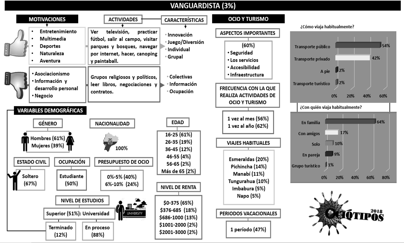 OCIOTIPO VANGUARDISTA. Les gusta como motivaciones principales y secundarias, aquellas que se relacionan con la innovación y las nuevas tecnologías ( Figura 9). Valoran las actividades lúdicas, tanto dentro de casa como al aire libre. Por otro se muestran indiferentes a la religión y la política. No es de su agrado las actividades formativas, ni tampoco las laborales. La única temporada de vacaciones que disponen al año, es aprovechada para visitar y conocer en familia, sitios turísticos de la Costa y Sierra ecuatoriana, y a los que suelen llegar en transporte público. El presupuesto destinado a actividades de ocio y turismo es bajo, ya que su renta es igual o menor a un (SBU). Mayoritariamente puntúan los estudiantes que actualmente están cursando el tercer nivel de educación.