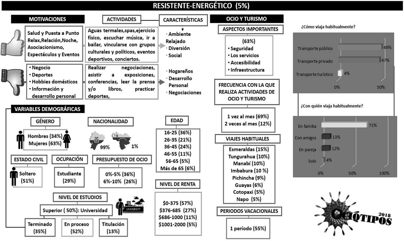 OCIOTIPO RESISTENTE-ENERGÉTICO.Les gusta como motivaciones principales y secundarias aquellas que se asocian a actividades relacionados con la armonía física, el equilibrio (mente, cuerpo, alma) les fascina el ambiente libre, los lugares de diversión y entretenimiento, les agrada el ambiente bohemio, pero sin descuidar el aspecto personal y su bienestar ( Figura 6). La única temporada de vacaciones que poseen al año lo aprovechan para viajar y visitar lugares que estén asociados a actividades de ocio y turismo en las tres regiones naturales?continentales del Ecuador , aunque prefieren utilizar el transporte público para llegar a sitios cercanos, para llegar a sitios lejanos prefiere el transporte privado para disfrutar la mayor parte del tiempo con la familia, el presupuesto destinado a actividades de esparcimiento es mínimo debido a que se deriva de la renta que es igual o menor a un (SBU) y tan solo una pequeña fracción es consignada a actividades de ocio y turismo, este dato es incuestionable debido a que más del 28% son estudiantes y más del 50% está cursando actualmente sus estudios de nivel superior.