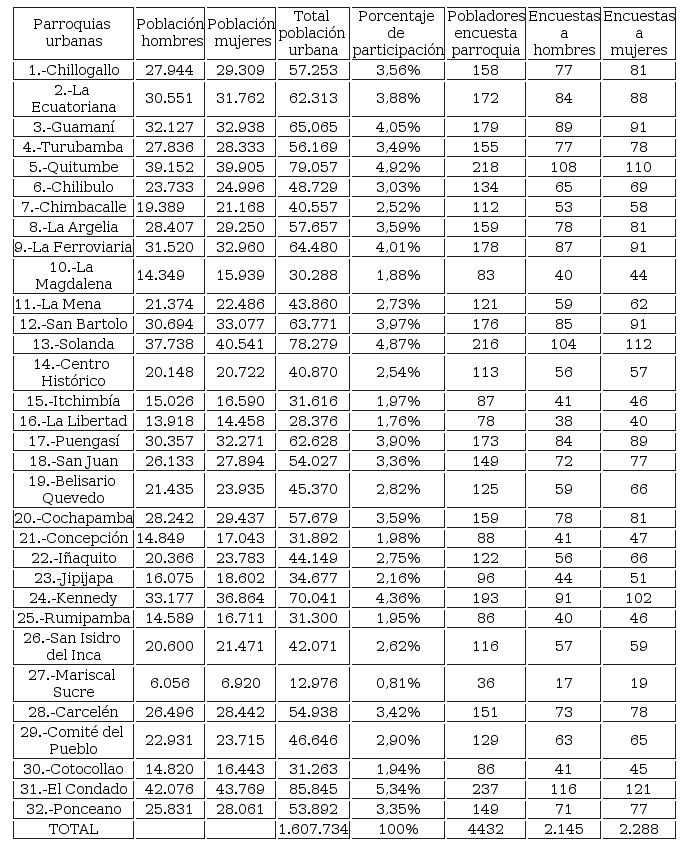 Con el cálculo estimado, se realizaron 4.432 encuestas, divididas en las 32 PU. La encuesta fue dirigida a los residentes de la ciudad de Quito, tomando en cuenta una edad mínima de 16 años. Se aplicó una propia metodología de agrupaciones para la obtención de los resultados, propuesta por Edison Molina Velásquez.