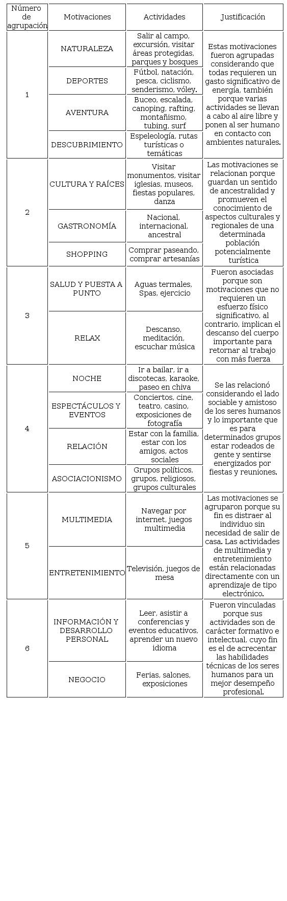El proceso de obtención de los 10 ociotipos, se basó en la identificación de las 18 motivaciones propuestas por Valls ( Tabla 2), dando la calificación de grado de importancia. Ranking 3 (lo más importante), Ranking 2 (medianamente importante) y Ranking 1 (menos importante). Posteriormente, se desarrolló una matriz general en Excel, con 8 tablas de agrupación de las motivaciones. En la tabla general, se obtuvieron 1.508 agrupaciones; es decir respuestas diferentes en relación con la elección de las 3 motivaciones ordenadas; luego de ello, en la tabla de agrupación 1, se juntaron a las motivaciones de ranking 3 y 2 semejantes en las respuestas encontradas, más la motivación ranking 1, que previamente se agruparon ( Tabla 3), tomando en cuenta su relación directa en las actividades encontradas en las motivaciones, se lograron 396 agrupaciones. En la tabla de agrupación 2, únicamente se tomó en cuenta a las elecciones 3 y 2, logrando 171 agrupaciones. La tabla de agrupación 3, se toma en cuenta a la motivación con calificación 3 y se la une a las motivaciones calificadas con 2, en base a la agrupación preliminar realizada de las motivaciones ( Tabla 3), se alcanzó 87 agrupaciones.