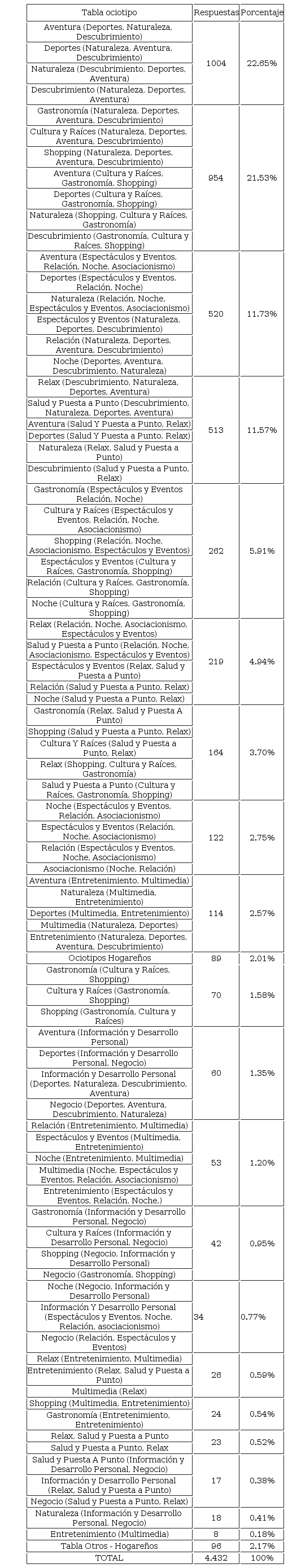 La tabla de agrupación 4, se caracteriza por tomar en cuenta a la motivación de elección 3, sumada a las respuestas valoradas en 2 de la tabla general y de la tabla de agrupación 1 que no pudieron ser asociadas, dando como resultado 87 agrupaciones. En la tabla de agrupación 5, las motivaciones rankeadas con 3 deben ser unidas con otras motivaciones de igual valoración, en relación con el criterio de agrupación ( Tabla 3), se obtuvieron 79 agrupaciones. La Tabla 4 se caracteriza por reunir a las dos motivaciones elegidas, sin tomar en cuenta el orden, dando como resultado 22 agrupaciones. Finalmente, la tabla de agrupación 7 se la desarrolló debido a que, en los datos no agrupados, existía una particularidad repetitiva en la elección de la motivación hobbies domésticos, que equivale a 2% de la muestra total. De las 22 agrupaciones obtenidas, se tomó en cuenta a los 10 ociotipos con porcentajes mayores al 2%, los cuales representan la mejor expresión del estudio con respecto a la significación, en base a la muestra tomada de 4.432 encuestas ( Tabla 4).