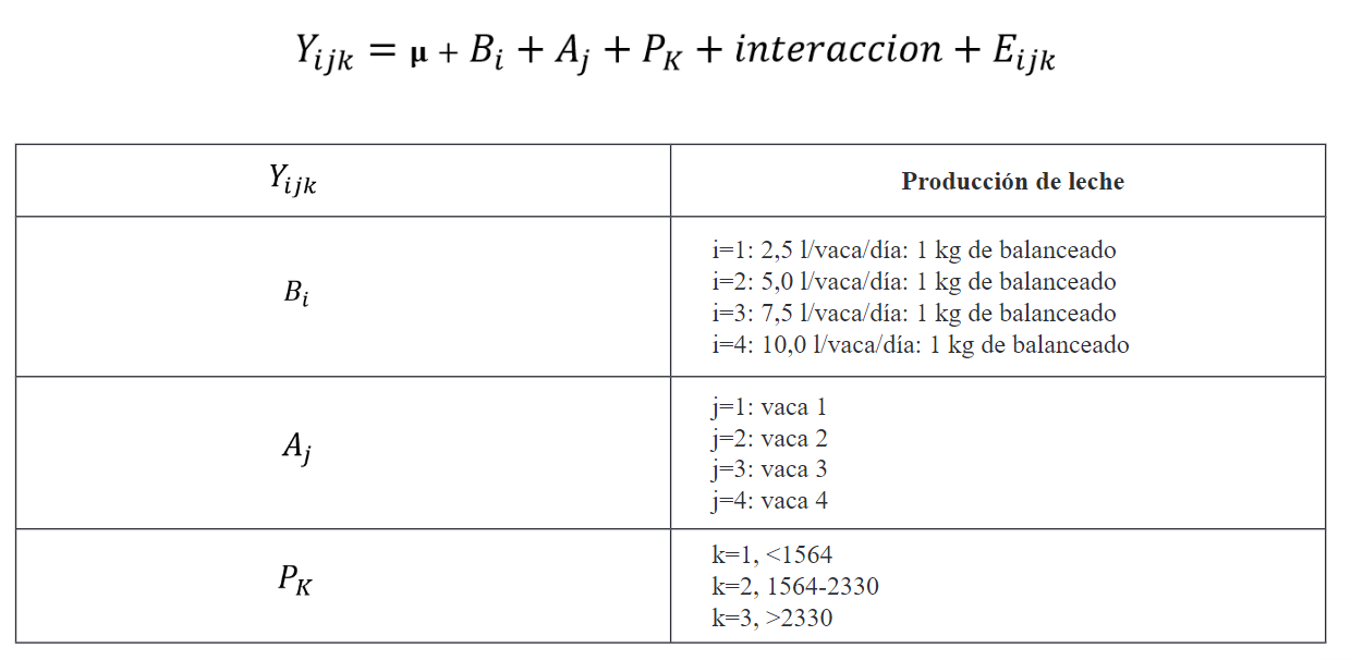 La eficiencia de uso del balanceado se determinó utilizando la ley de rendimientos decrecientes (también llamada rendimientos marginales decrecientes): es la disminución marginal del incremento del producto o servicio (por unidad) en un proceso productivo conforme se añaden nuevos factores productivo ( Hernández, 2017). Se relacionó la producción (L/vaca/día) con la cantidad de balanceado (kg/vaca/día) y se estimó la eficiencia de uso para cada uno de los tratamientos, aplicados de acuerdo con la siguiente fórmula: