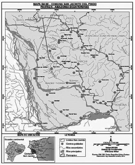 La comuna San Jacinto abarca las parroquias de Madre Tierra y Tarqui, ubicadas en los cantones de Mera y Pastaza, en la provincia de Pastaza, región amazónica. La comuna se encuentra en la parte alta de la cuenca hidrográfica del río Pastaza, presenta una temperatura media anual que varía entre 17,9° a 22,6 °C. y una pluviosidad entre los 1.251 mm a 4.746 mm, corresponde a la formación vegetal bosque siempre verde montano bajo. La población de la comuna corresponde en un 93% a la nacionalidad Kichwa, 6% Shuar y 1% Achuar ( Lamiña, 2014).