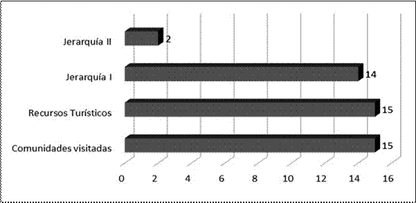 De los 31 sitios de interés turístico identificados en las 15 comunidades sistematizadas, una vez ponderados los parámetros de valoración de jerarquización turística, se enfoca en la existencia de 15 recursos turísticos, es decir, los mismos guardan características elementales que puedan promover en lo posterior actividades de visita turística, 14 sitios son considerados como jerarquía I, por tanto al momento tienen ciertas características de interés local y 2 sitios con jerarquía II, es decir, cuentan con condiciones básicas que promueven el interés turístico de los pobladores de la zona, sin embargo, resulta necesario el promover acciones para garantizar el desarrollo de productos turísticos integrados entre las comunidades a fin de que puedan ser difundidos en la población para garantizar su consumo, no solo a nivel local ( Figura 6).