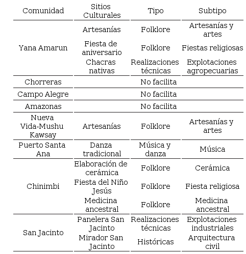 Las visitas de campo realizadas a 15 comunidades sistematizadas, permitió identificar 31 sitios turísticos ( tablas 1 y 2), que conforme la clasificación de atractivos turísticos se ubican 21 en la categoría de sitios naturales y 10 sitios en manifestaciones culturales, cada una con su tipo y subtipo ( Figura 5), siendo la comunidad La Encañada la que mayor riqueza natural posee, y las comunidades de Chinimbi y Yana Amarun las que mayor presencia de manifestaciones culturales ofrecen al visitante.