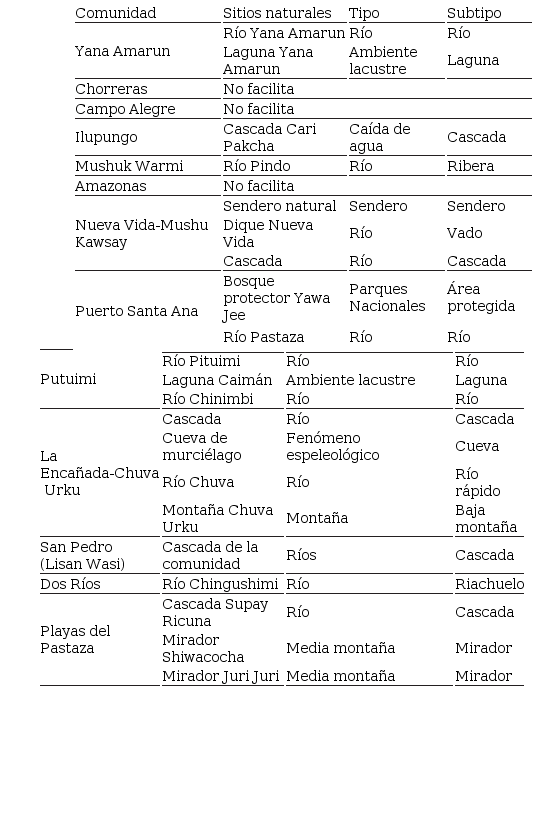 La comuna está conformada por 37 comunidades ( Figura 1), de las cuales 15 fueron sistematizadas, puesto que en las mismas se evidenció la existencia de recursos naturales y culturales con posibilidad de ser aprovechadas en el ámbito turístico. Las comunidades estudiadas son las siguientes: Yana Amarun, Chorreras, Campo Alegre, Ilupungo, Mushuk Warmi, Amazonas, Nueva Vida-Mushu Kawsay, Puerto Santa Ana, Putuimi, Chinimbi, La Encañada-Chuva Urku, San Pedro (Lisan Wasi), San Jacinto, Dos Ríos y Playas del Pastaza.