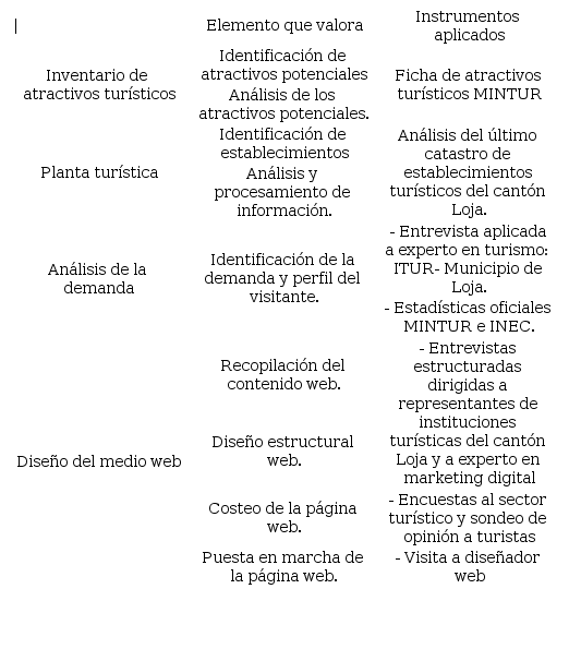 Como primer punto, se definió en qué entorno se realizaría la investigación de campo y qué instrumentos se iban a necesitar para lograr los objetivos ( Figura 1). Luego, se delimitó el área de estudio, lo cual permitió no extenderse más allá de los límites necesarios para realizar la investigación. En el caso de este proyecto se delimitó desde Loja (provincial) a Loja (cantonal). La revisión de documentos basado en libros, folletos turísticos emitidos por las diferentes entidades, catastros, boletines estadísticos, planes de desarrollo, proyectos académicos entre otros. La planificación del proyecto se centró en aspectos fundamentales: el recurso humano: actores involucrados y profesionales en el campo; la metodología: de carácter cualitativa, lo que implicó las diferentes entrevistas y cuantitativa que involucró encuestas y sondeos de opinión. Los materiales: los necesarios para la recopilación de información como computadoras, cámaras fotográficas, grabadora de voz; y los limitantes de estudio tomando en cuenta al tiempo y posibles fuentes de información no académicas u oficiales.