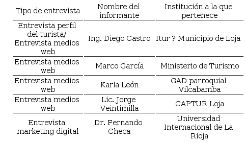 Para Kvale (2011), las entrevistas son uno de los principales métodos de recolección de datos dentro del enfoque cualitativo. En ellas se intercambian ideas mediante un cuestionario minucioso entre el entrevistador y entrevistado con el propósito de abordar temas de interés. Para poder diseñar las entrevistas, se dividió en tres partes: una primera entrevista enfocada en el perfil del turista que ha visitado el cantón Loja; un segundo tipo de entrevista enfocado en las necesidades de información que requiere el portal web como herramienta de promoción turística, y una última enfocada en marketing digital. Y se realizó un esquema de entrevistas ( Tabla 2).