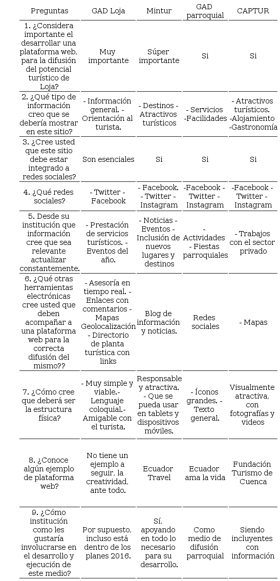 A continuación, se exponen los resultados obtenidos en las entrevistas realizadas a los actores involucrados en base a la estructura de un sitio web como herramienta de promoción turística del cantón Loja.