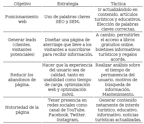 Se considera que es necesario contar con una plataforma web y redes sociales con información turística, recalcando una vez más que una página web forma parte del marketing digital, y que es una de las herramientas base para poder tener éxito en los objetivos de marketing que se quieren cumplir en el presente caso. Para Fernando Checa (profesor, investigador y experto en marketing digital y social media, autor de más de 20 publicaciones especializadas en España), es imprescindible contar con una página web, sobre todo si entre los objetivos está el posicionamiento de la marca de un producto o servicio mediante internet. Un plan de marketing digital debe trazar objetivos, con estrategias y tácticas para poder alcanzarlos.