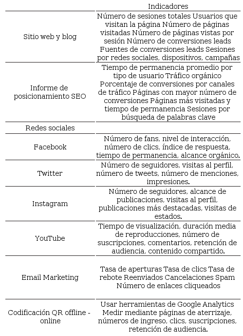 Con la lista de indicadores presentada en la Tabla 5, se puede medir resultados, esto da una claridad sobre si las estrategias y tácticas están funcionando correctamente, además se puede medir por temporadas de acuerdo a los objetivos. Es recomendable tomar resultados semanales, mensuales y anuales. En el caso de las redes sociales y posicionamiento web, es posible realizar pagos por publicidad si así se lo requiere, de esta forma se obtienen resultados en un tiempo más corto (resultados que aparecen por lo general como anuncios en los motores de búsqueda) y que incluso se podría pagar para obtener un mayor alcance, es muy necesario en campañas en las que queremos que llegue a un público específico en un corto tiempo, que el esperar por resultados ?orgánicos? (resultados que se convierten a largo plazo y que aparecen y se posicionan de forma natural sin la necesidad de ser influenciados por la publicidad de pago) estos pueden posicionarse según su relevancia en cuanto al término de búsqueda.