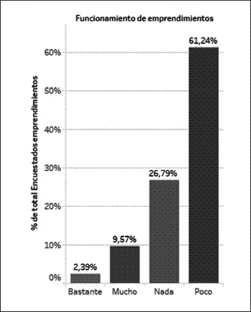 De forma similar a la pregunta anterior, 9 de cada 10 personas dan una evaluación negativa acerca de no conocer nada de la evolución de los emprendimientos ( Figura 10). Además, los comuneros en las conversaciones generadas sobre el tema comentan que muchos de los emprendimientos relacionados con el producto turístico son de asociaciones que se crearon para poder trabajar con la empresa. Tal es el caso de la ?Asociación Nariz del Diablo?, cuyos integrantes trabajan en conjunto con la comunidad de Tolde, quienes se encargan de la demostración de danza y se turnan para las presentaciones. En el caso de la ?Asociación de mujeres tejedoras de Nizag?, que se originó en el año 2006 con 80 mujeres apadrinadas por el Programa de Pequeñas Donaciones de las Naciones Unidas, procedieron a la creación jurídica y a gestionar para que la comunidad de Nizag fuese tomada en consideración para la obtención de stands. Los productos realizados por la Asociación son comercializados en la estación Nariz del Diablo, cuyos contratos son renovados anualmente. Entre tanto en el museo étnico, las personas que trabajan en el lugar son parte de FEEP, las cuales se encargan de su administración y organización.