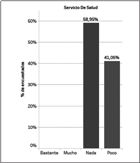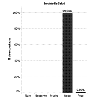 El mejoramiento del aspecto salud en relación con la vinculación con el proyecto turístico es nulo ( Figura 33), pues en este sentido el estar dentro del proyecto Tren Crucero no ha generado dicha ayuda. A pesar que la comunidad tiene su centro de salud, este lugar aún no se encuentra equipado debidamente para atender mayores problemas, razón por la cual la población esperaba mejorar el estado del mismo con la ayuda de la vinculación al Tren Crucero.