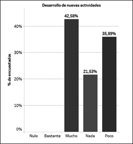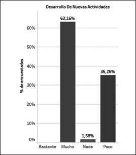 Con respecto al desarrollo de nuevas actividades en la comunidad, en la figura 19 se indica que esto sí se ha presentado en un 42,58%, puesto que una de las actividades con las que colaboran con el Tren Crucero son las artesanías que se elaboran con la materia prima que se obtiene de los pencos que la misma población cosecha; así también aportan con productos típicos de la región para la venta en la cafetería de la estación, pero la actividad económica aún es débil.