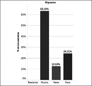 Sobre el tema de la migración, la comunidad manifiesta en un 77% que es Poco el impacto generado por la vinculación de la comunidad al proyecto Tren Crucero ( Figura 18). Ya que las asociaciones desarrolladas en la comunidad no han tenido la influencia necesaria para mitigar dicho fenómeno. Por tanto, el Tren Crucero no ha creado suficiente empleo para evitar la migración y ciertamente no ha generado tampoco expectativa en los jóvenes de la comunidad para desarrollar carreras referentes a las actividades con el Tren Crucero.