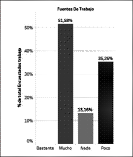 En lo que respecta a la pregunta sobre fuentes de empleo la comunidad estudiada indica con un 49,76% que Poco ( Figura 20), es decir, la evaluación es algo positiva puesto que 4 de cada 10 personas señalan que sí ha contribuido al desarrollo de nuevas (aunque pocas) fuentes de trabajo la vinculación del Tren Crucero con la comunidad, ya que hay una variedad de actividades que ofertan a la empresa, pero todavía no es suficiente. En las asociaciones los puestos de trabajo son: