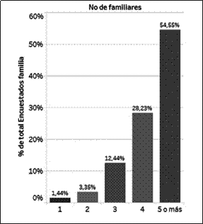 El número de personas que componen un hogar de la comunidad estudiada (Nizag) en su mayoría es de más de 5 integrantes ( Figura 8). Este dato está acorde a la realidad rural del país, ya que las familias son numerosas y superan la media de 1,6 hijos por familia, a diferencia de las familias del sector urbano, según el INEC (2010). Es decir que Nizag, al estar ubicada en una zona rural del país, se encuentra dentro de los parámetros de personas promedio que tiene cada familia rural, con 3,8, según datos del INEC (2010), por ende, el número de miembros está acorde con las estadísticas nacionales.