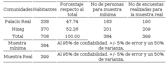 Obteniendo un resultado 384 individuos a encuestar. La muestra fue estratificada en función de las dos comunidades ( Tabla 1)