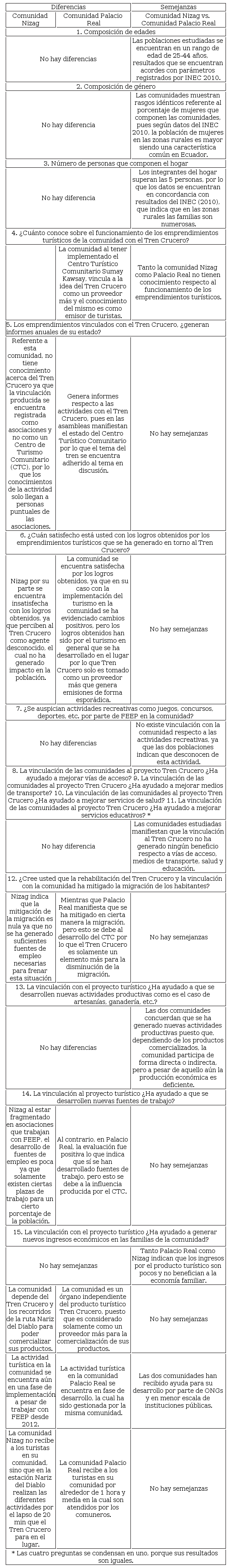 Al término del análisis de las encuestas implementadas es necesario realizar las respectivas consideraciones de diferencias y semejanzas que se han encontrado en la investigación de campo ( Tabla 2), la cual fue de suma importancia para observar la realidad de las comunidades y con base en estas se pueda extraer información de importancia para poder apreciar de forma general cómo se han desarrollado dos comunidades indígenas que se encuentran vinculadas con el producto Tren Crucero.