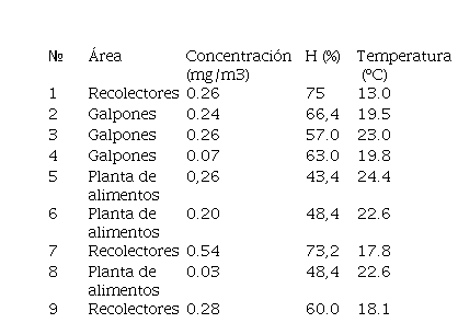 Estos resultados permiten afirmar que el personal de la empresa está expuesto a una cantidad tolerable de polvo total (fracción respirable), disminuyendo la posibilidad de que puedan contraer, a causa del trabajo, patologías de vías respiratorias bajas. La temperatura tiene una relación inversamente proporcional con la humedad relativa, y esto se puede evidenciar en las mediciones realizadas en el estudio en cada una de las áreas ( Flores Cerdan, 1998).