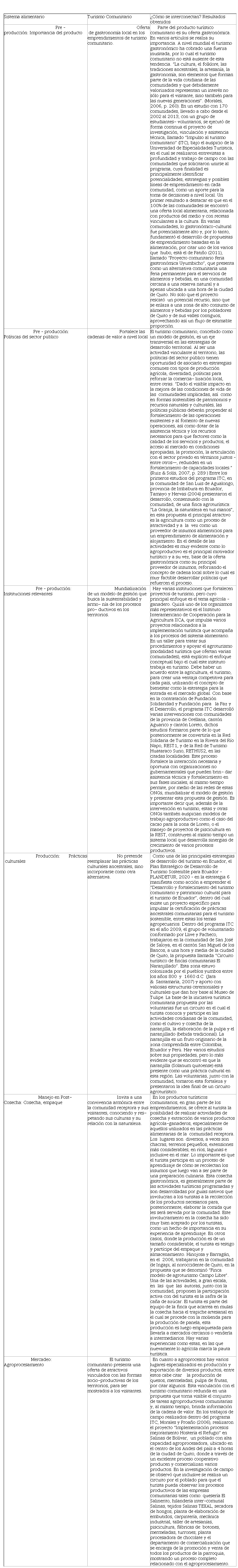Desde este enfoque el turismo comunitario tiene varios puntos de unión con los procesos y subprocesos del sistema alimentario, bajo el cual se sostienen los objetivos planteados en la soberanía alimentaria. En la Tabla 2 se presentan los resultados y ejemplificaciones de estos enlaces.